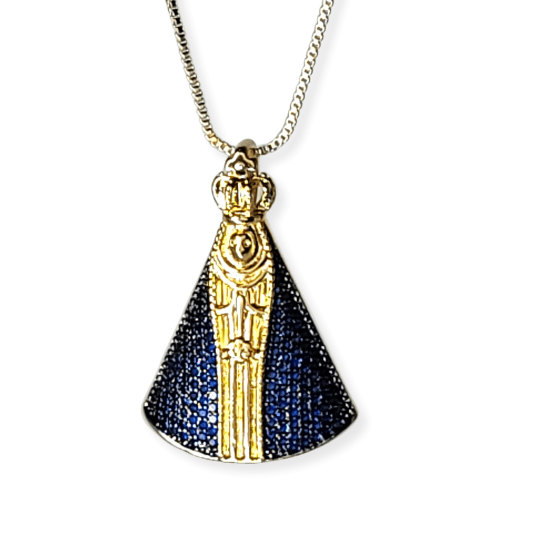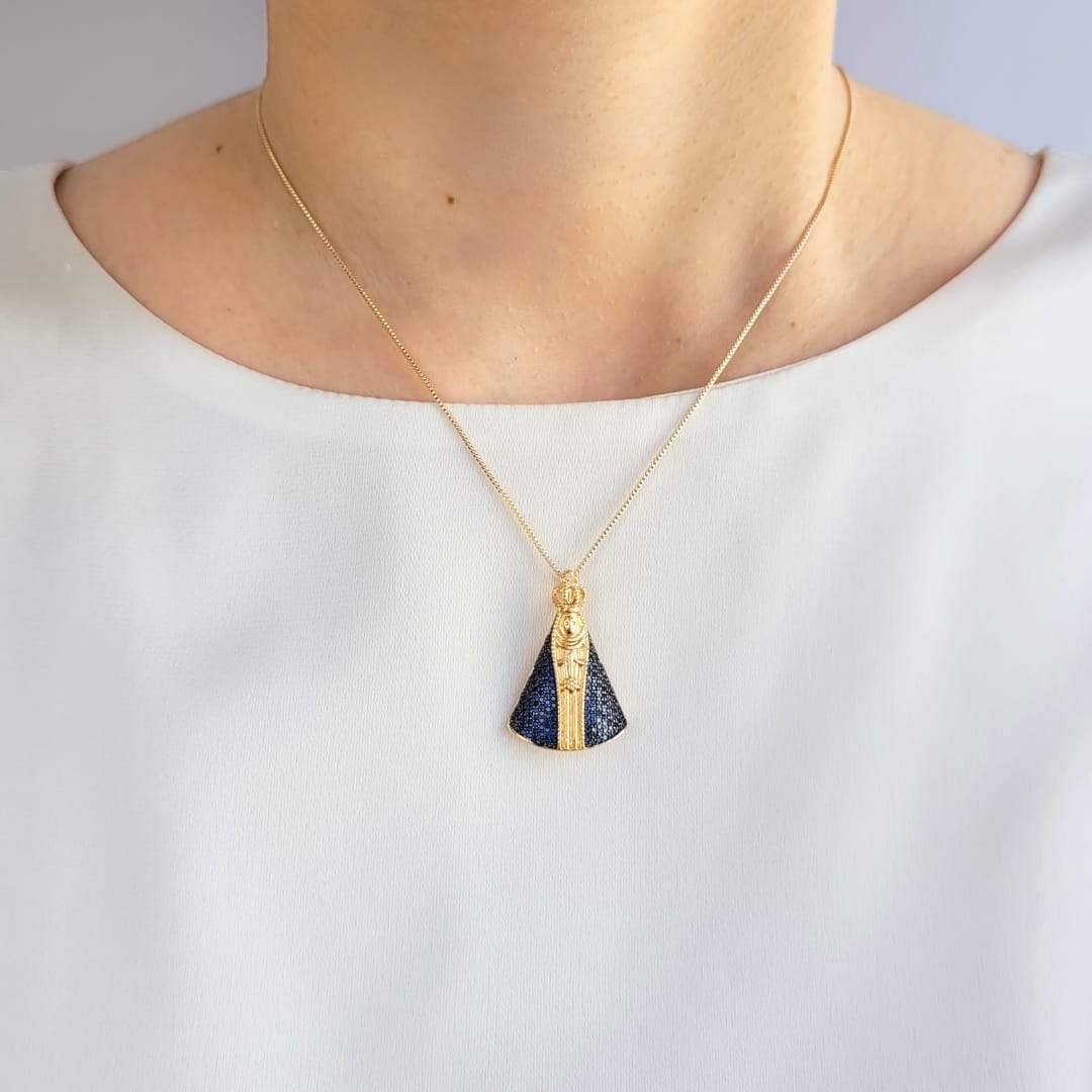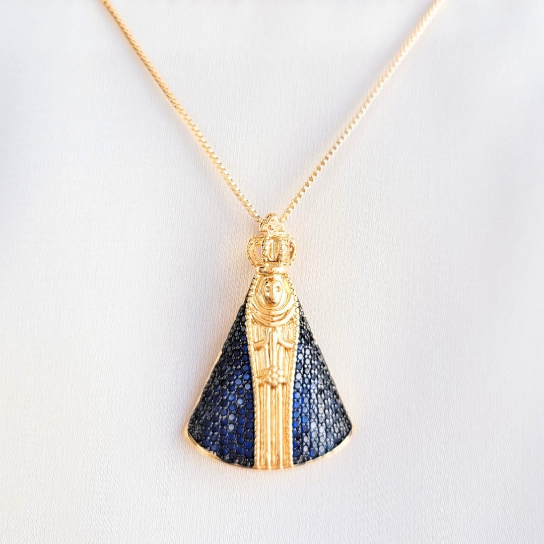 Colar pingente N.Sra.Aparecida cravejado micro zirconias safira banho ouro 18k
