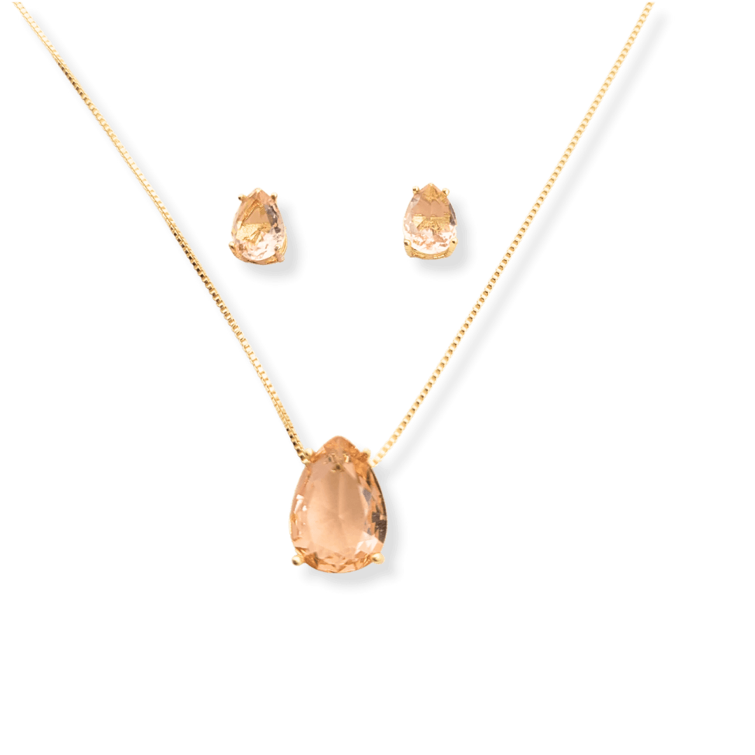 Conjunto colar e brinco ponto de luz formato gota cristal lapidado cor light peach banho ouro 18k