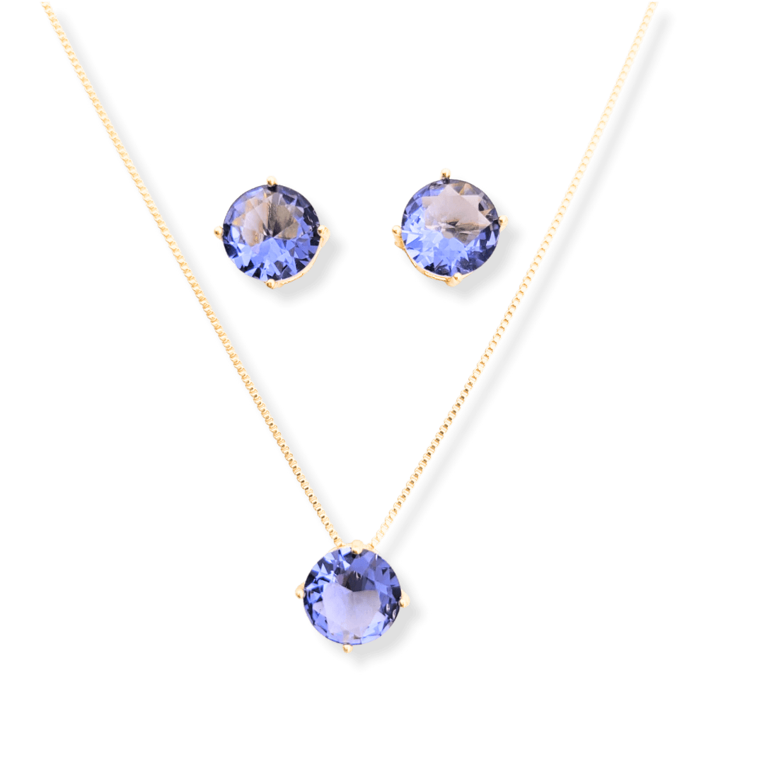 Conjunto colar e brinco ponto de luz formato redondo zircônia cor ametista banho ouro 18k