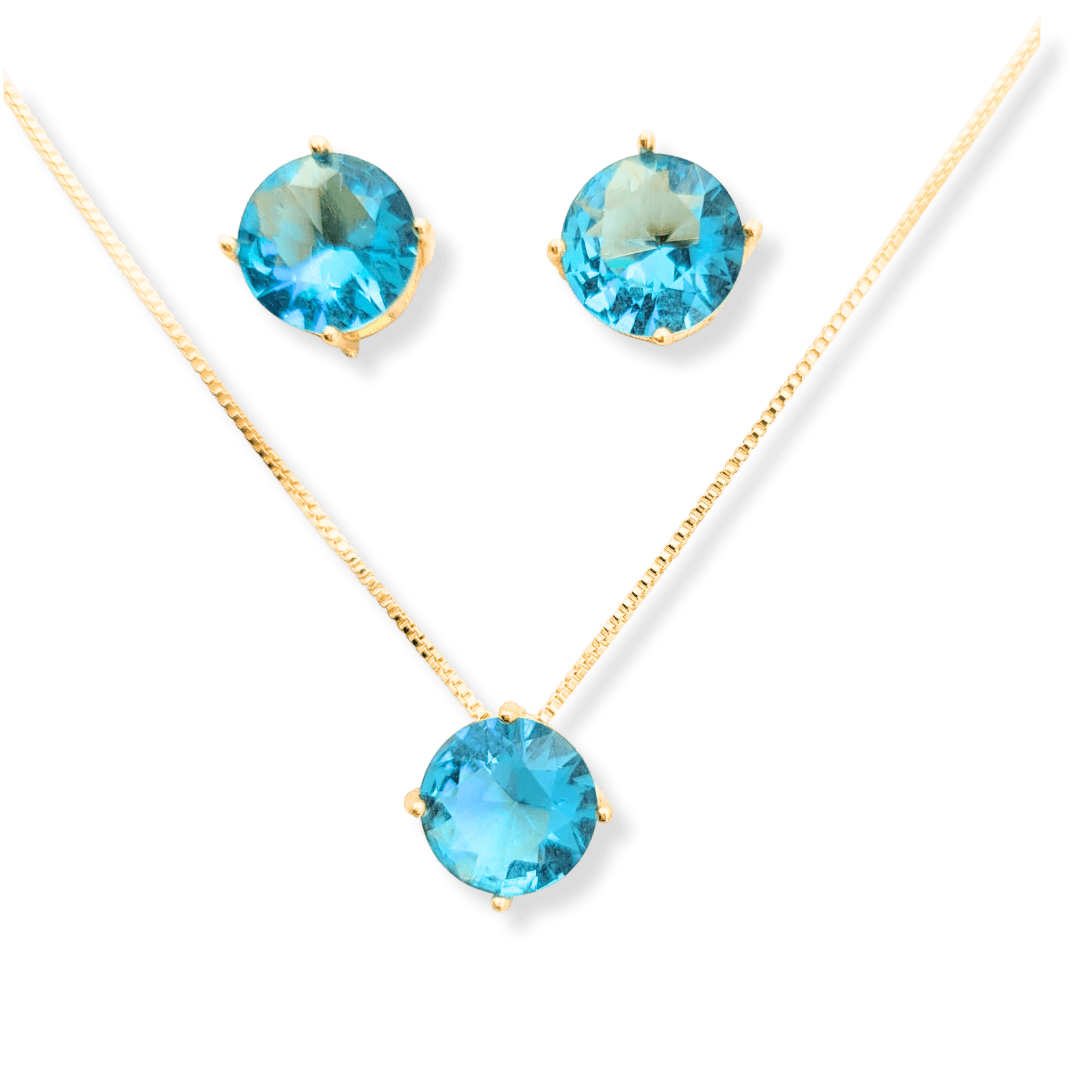 Conjunto colar e brinco ponto de luz formato redondo cristal lapidado cor turmalina banho ouro 18k