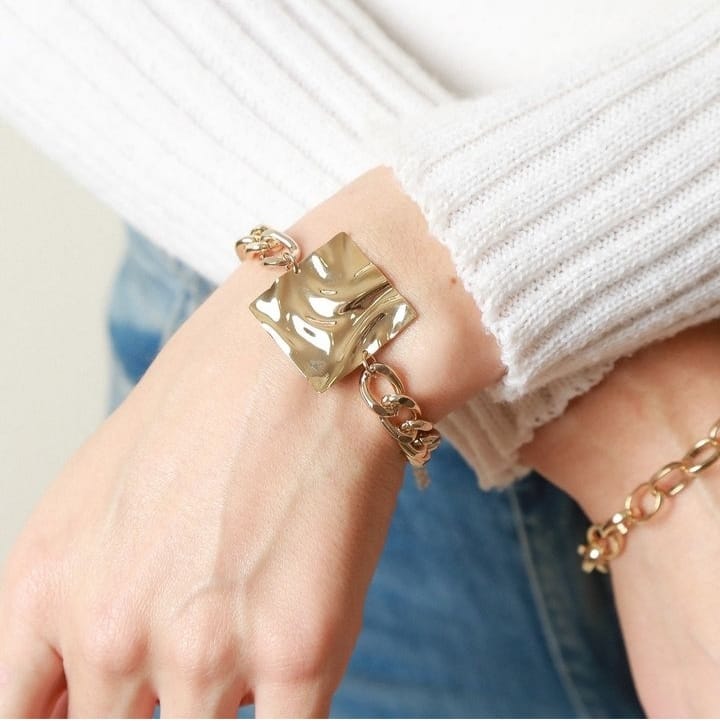 Pulseira corrente groumet com quadrado martelado banho ouro 18k